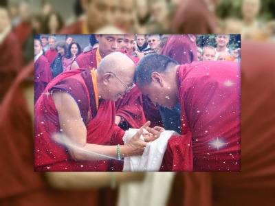 H.H. Gyalwang Karmapa Urgyen Trinley Dorje (rechts) und meinen Lehrern: Dem Ehrwüdigen Kyabje Tenga Rinpoche und Seiner Eminenz Sangye Nyenpa Rinpoche (im Bild links oben).